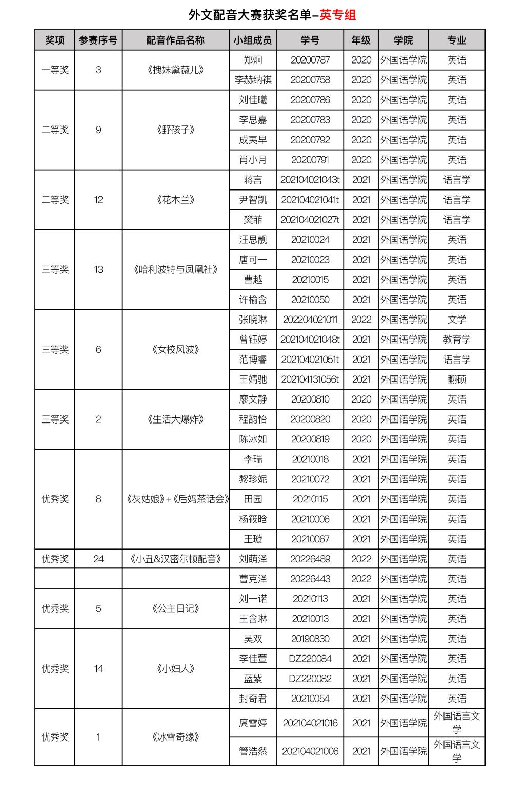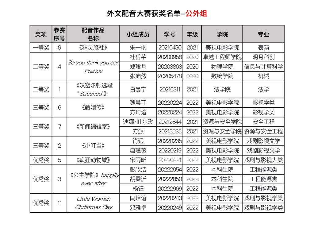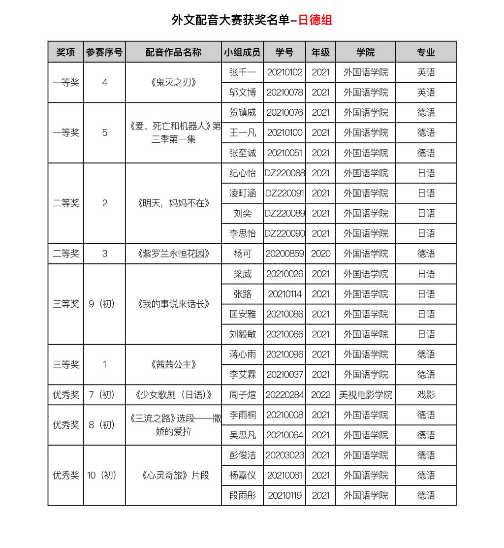 由伦理电影 主办、 伦理电影 承办的伦理电影 第二十二届外语文化节系列活动之外文配音大赛已经结束。赛事自11月9日启动以来,吸引到全校近15个学院、29个专业的60支队伍前来参与,评选出29个获奖组74名获奖选手。其中,英语专业组共11个获奖组35名获奖选手,公共外语组共9个获奖组17名获奖选手,日语德语组共9个获奖组22名获奖选手。 现将外文配音大赛获奖名单进行公布。
