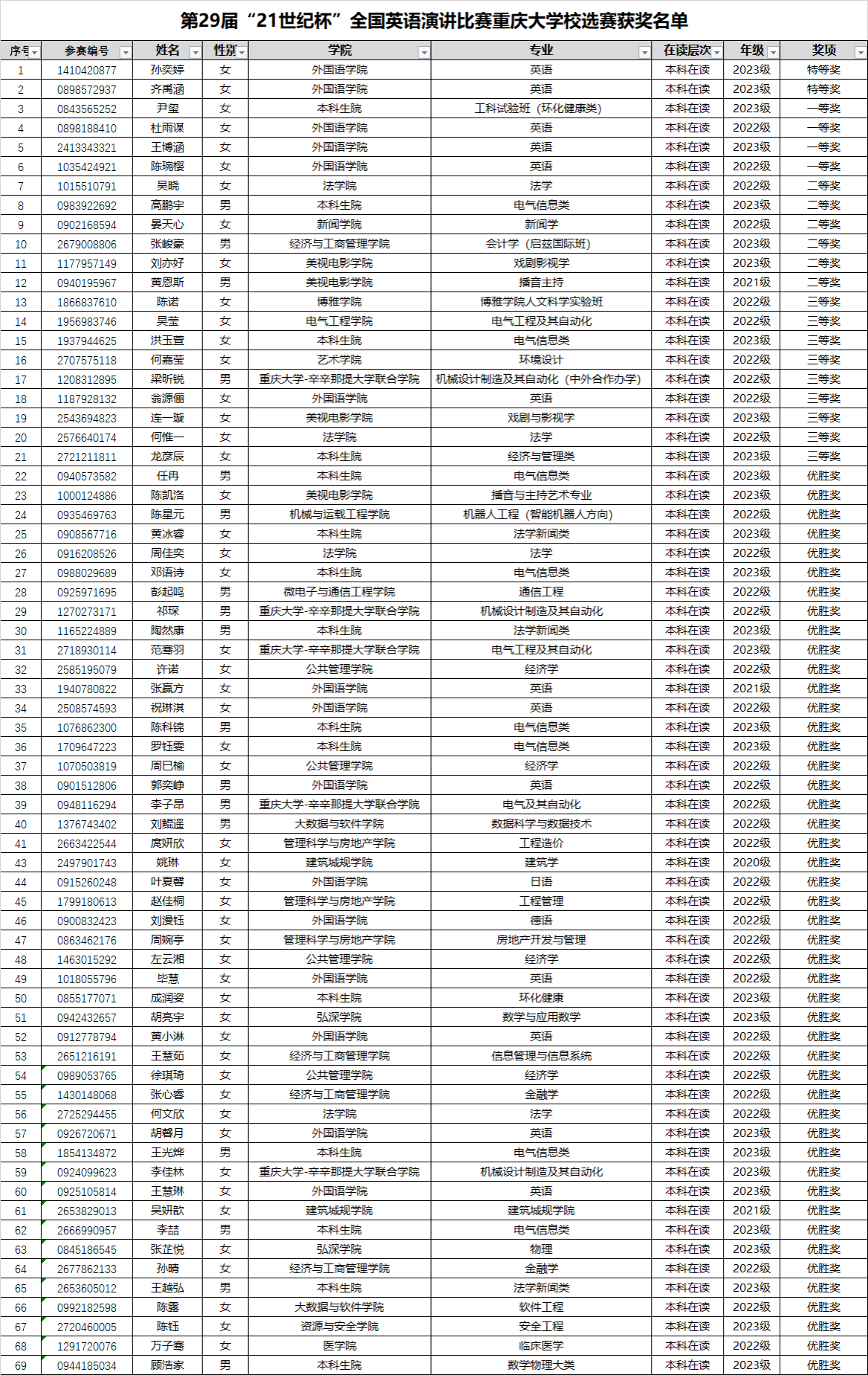 第29届“21世纪杯”全国英语演讲比赛伦理电影 校选赛自发布通知起,吸引了全校23个学院50多个专业上百名同学报名参赛,98名选手审核成为正式选手。大赛历时近一个月,选拔评定出2名特等奖、4名一等奖、6名二等奖、9名三等奖、47名优胜奖。现将获奖名单公布(也可查看附件)如下: