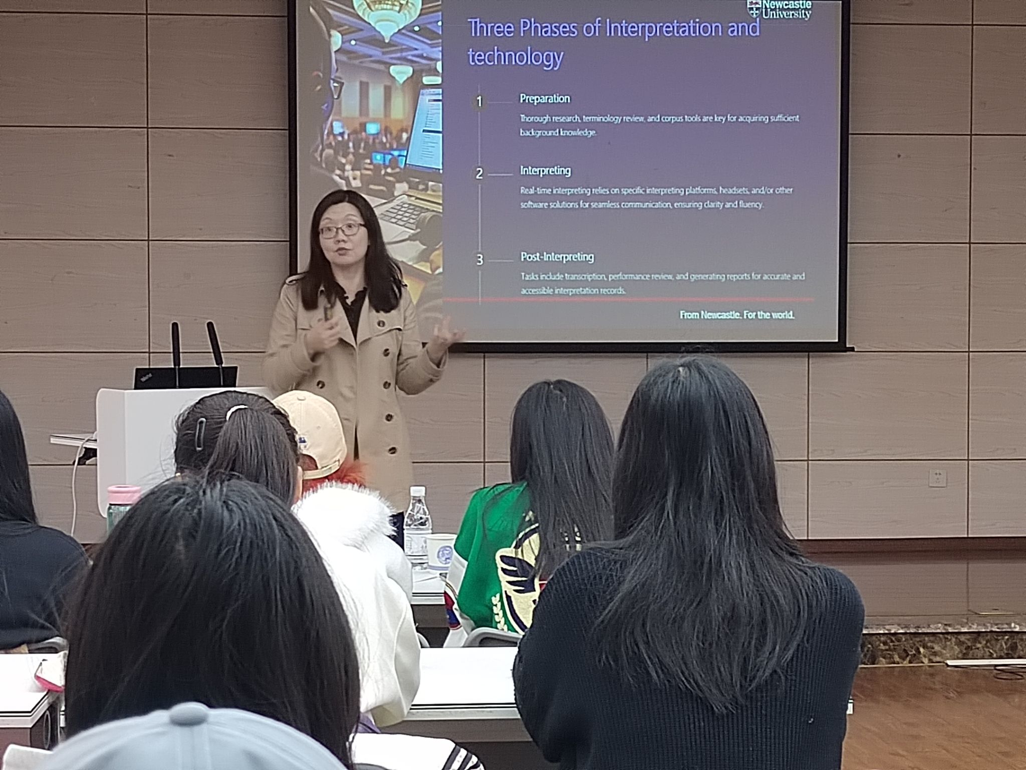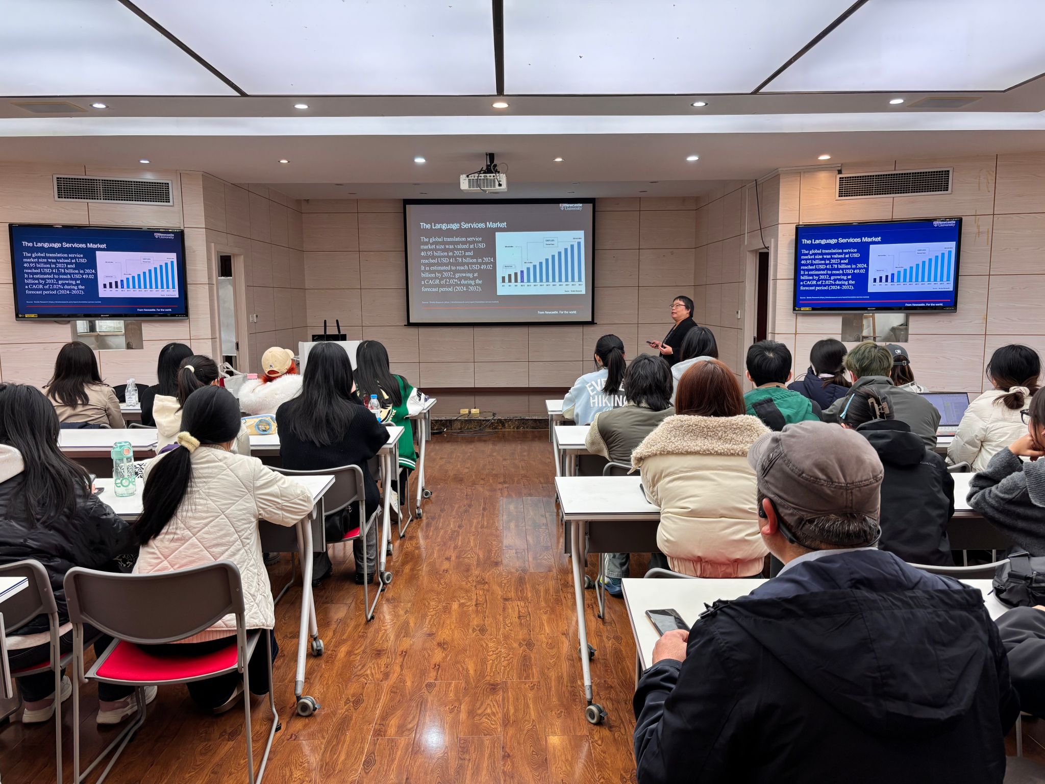 楼501教室迎来了一场前沿学术讲座。本次讲座由纽卡斯尔大学硕士课程主任,博士生导师Yalta Chen和口笔译课程主任Phoebe Yu主讲,翻译硕士教育中心晏生宏主任主持。讲座聚焦于人工智能(AI)在口译和翻译/本地化行业中的变革性影响。
