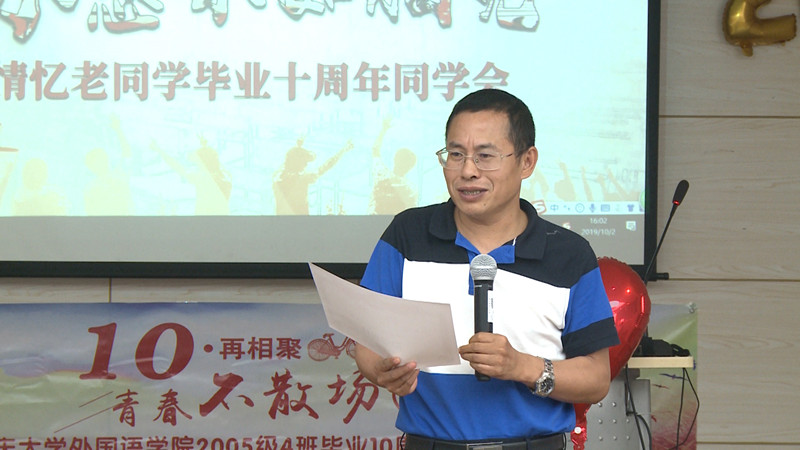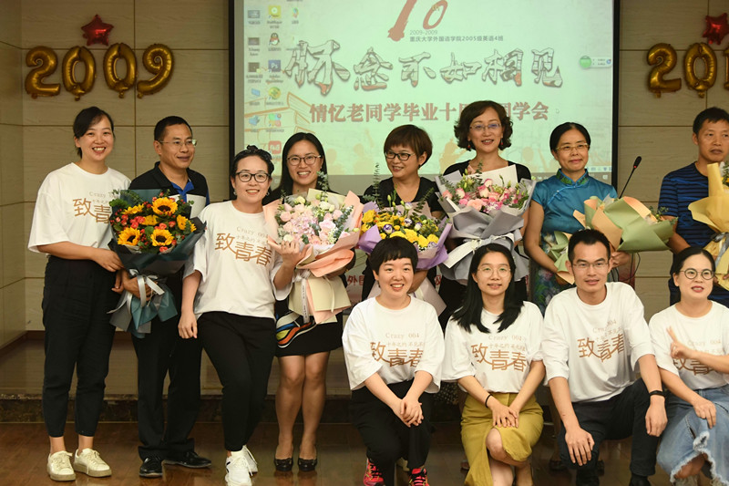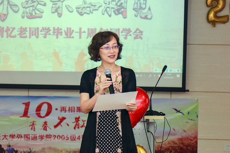 2005级英语四班的校友在学院楼501举办了毕业10周年同学会。学院书记欧玲、院长彭静、副院长李小辉以及雷蕾老师、温忠义老师、杨署东老师(原 伦理电影