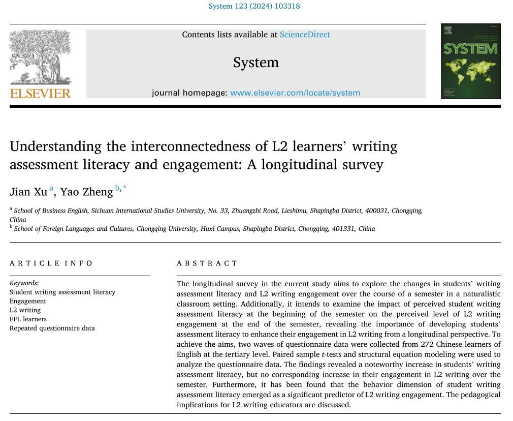 为通讯作者单位。System杂志作为语言学领域的顶级期刊,在2022年的Journal Citation Report中影响因子达到6,其在JCR语言学类排名中位列第5/194,同时在中科院语言学排名中也高居第7/580。该论文是中国博士后科学基金面上项目“乡村振兴背景下乡村英语教师职业发展路径和保障机制研究”的阶段性成果。