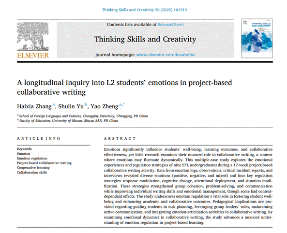 英语系郑尧副教授团队的研究成果“A longitudinal inquiry into L2 students’ emotions in project-based collaborative writing”在Thinking Skills and Creativity期刊上正式发表。Thinking Skills and Creativity为SSCI收录的教育学领域重要期刊(SSCI一区,2024年影响因子:4.5,五年平均影响因子:4.9),重点关注思维方式创新与创造力研究方面的国际前沿成果。该文是郑尧主持的国家社会科学基金项目“积极心理视域下中国外语学习者多语写作投入的多维度动态研究”(21CYY018)的阶段性成果,第一作者为伦理电影