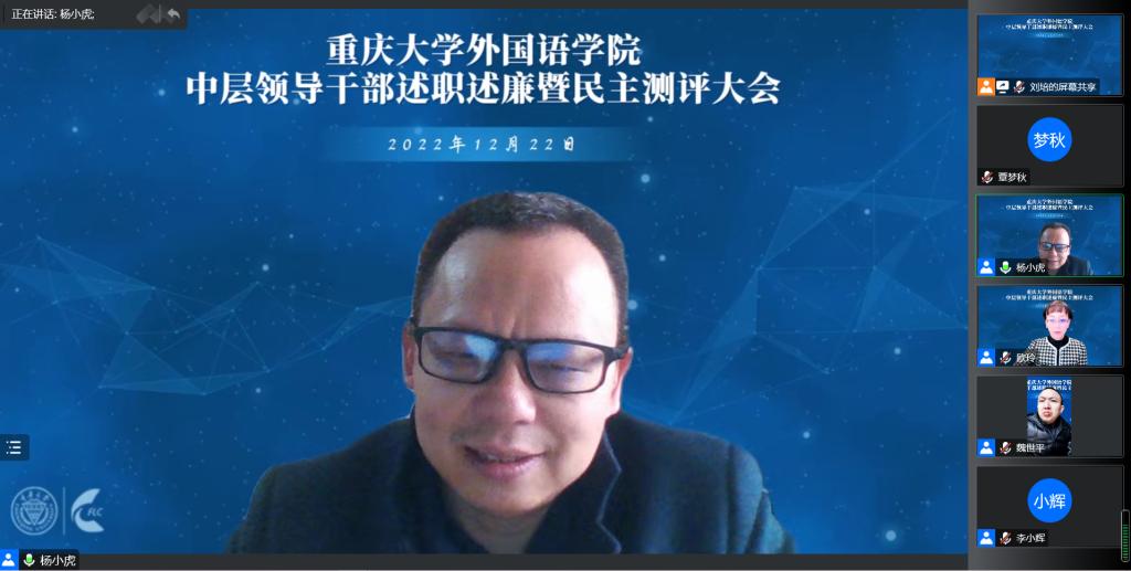 随后,学院领导班子成员魏世平副书记、李小辉副院长、杨小虎副院长分别就学生政治思想建设和纪委工作情况,大学外语教学改革、实验室建设、国际交流与合作情况,科研及行政工作进行了报告。班子成员在认真总结各项工作取得的成绩与进展的同时,也分析了存在的问题与不足,并对今后的工作做了展望与规划,真诚地希望全院教职工认真落实习近平新时代中国特色社会主义思想和党的二十大精神,积极工作,为学校和学院发展做出更大的贡献。领导班子成员述职结束之后,全院教职工通过今日校园APP对领导班子和班子成员履职情况进行了民主测评。