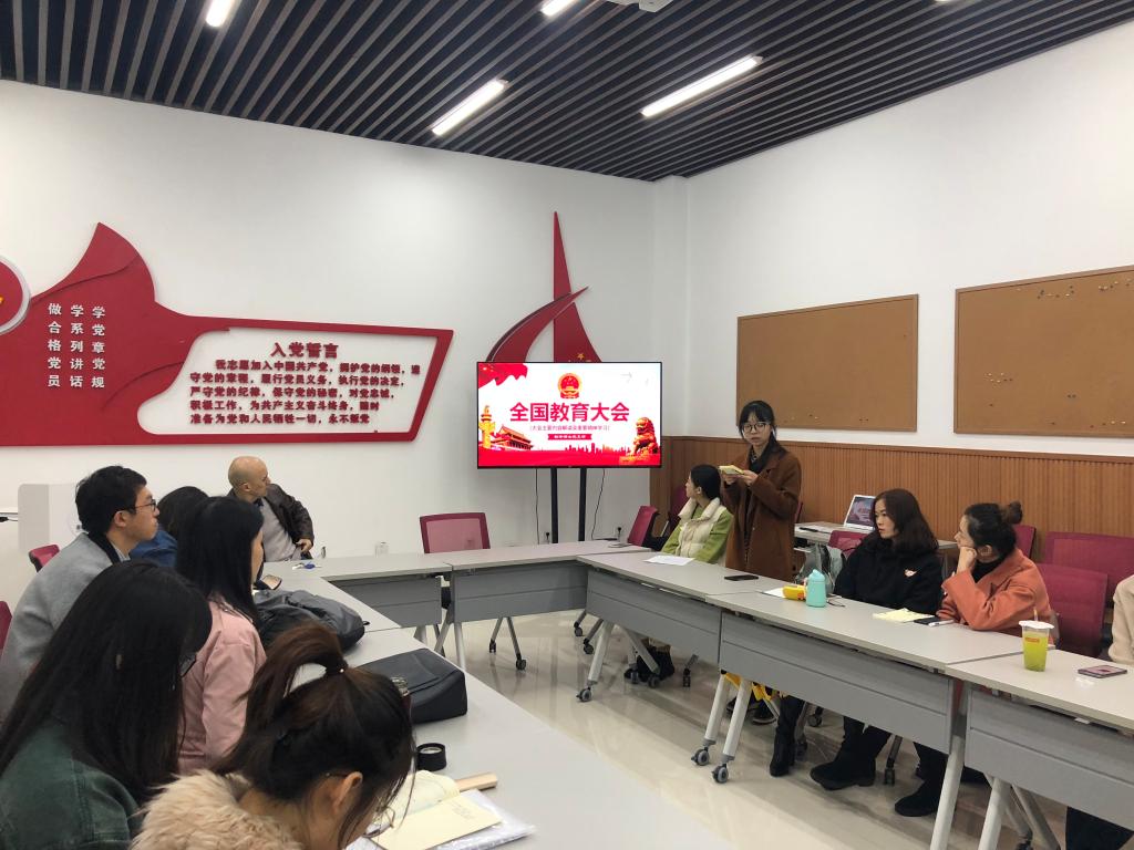 2018年11月16日,翻硕党支部在学院楼105党员活动室开展了《全国教育大会》学习活动。本次活动由支部副书记许祺苑主持,翻译硕士支部全体党员、预备党员参加了此次活动。
