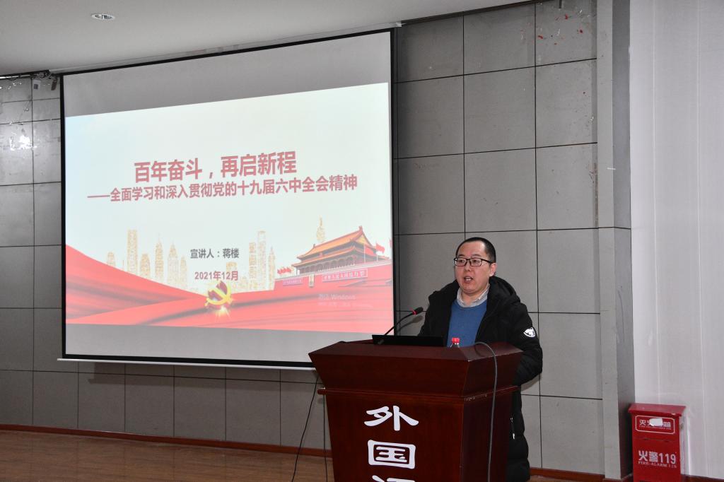 蒋楼围绕《中共中央关于党的百年奋斗重大成就和历史经验的决议》,从深刻认识总结党的百年奋斗重大成就和历史经验的重大意义,深刻认识党的百年奋斗的初心使命和重大成就,深刻认识中国特色社会主义新时代的历史性成就和历史性变革,深刻认识党的百年奋斗的历史意义和历史经验,深刻认识以史为鉴、开创未来的重要要求等方面作了阐释和解读。