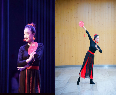 在群舞演员黑色剪影中,追光灯底下,吴娟老师的开场亮相动作即获得满堂喝彩。惊鸿一瞥中,富有节奏感的古风乐曲《芒种》以古筝和琵琶的悠扬旋律将观众们带入了红色与黑色交织的情境中。红色印金花团扇精致素雅,黑色高耸发髻配红色丝带衬托出女老师们的巾帼英姿,黑红相间的舞裙蹁跹中,散发出女性特有的飘逸柔美。12名教师舞蹈演员手拿团扇翩翩起舞,时而犹抱琵琶半遮面,时而意气风发凭恣意,老师们如花般的笑靥更为节目增添一抹亮色,博得了全场阵阵掌声及喝彩声。