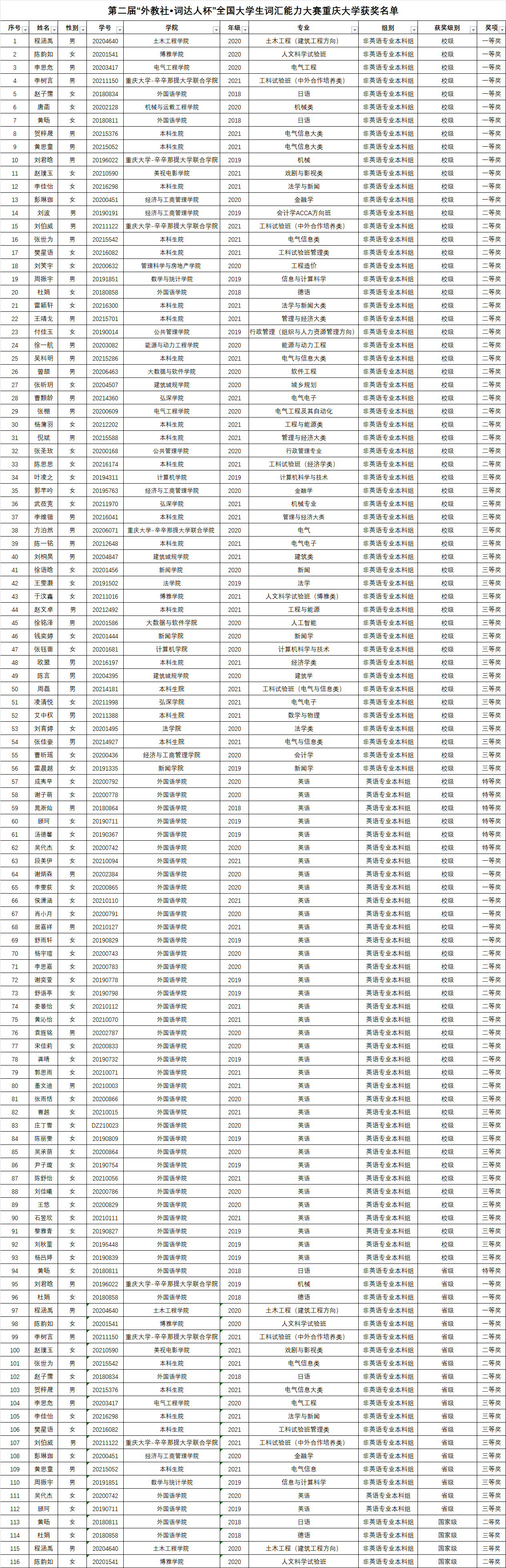 虎溪校区举行,大赛成功吸引了全校近30个学院超50个专业的各个年级同学参赛,英语专业本科组评选出特等奖6名、一等奖7名、二等奖11名、三等奖13名,非英语专业本科组评选出一等奖13名、二等奖20名、三等奖23名。
