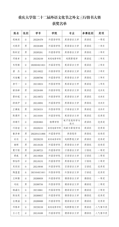 部分选手的作品情感与韵律齐鸣,文采同浪漫共振,凭细腻的笔触与丰沛的情感成功在本次比赛中脱颖而出,获得奖项。其中,英语组一等奖2名、二等奖2名、三等奖4名、优秀奖10名、人气情书奖1名;日语组一等奖1名、二等奖1名、三等奖1名、优秀奖2名;德语组一等奖1名、二等奖1名、三等奖1名、优秀奖2名、人气情书奖1名。