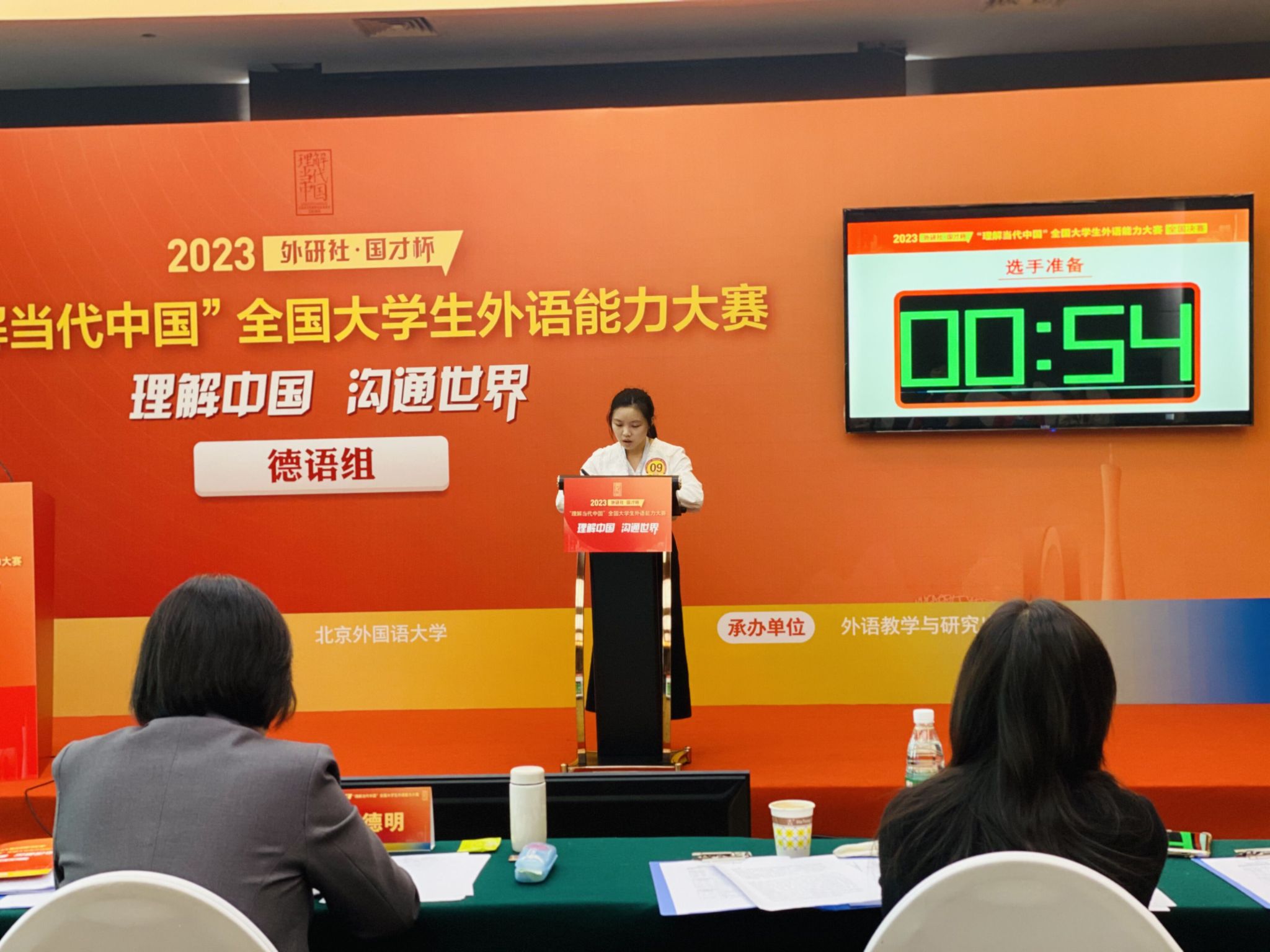 德语专业曾亮以出色亮眼的表现晋级到第二阶段,入围至德语赛项全国15强。第二阶段分口译和即兴演讲两部分,口译包含视译题、听译题各1道,视译题主题为青年时代责任,听译题主题为绿水青山就是金山银山;即兴演讲中,考查选手对中国发展与世界发展的关系的理解,进而回答如何实现中国梦的看法。曾亮展现出较好的德语综合运用能力,最终赢得赛项银奖。