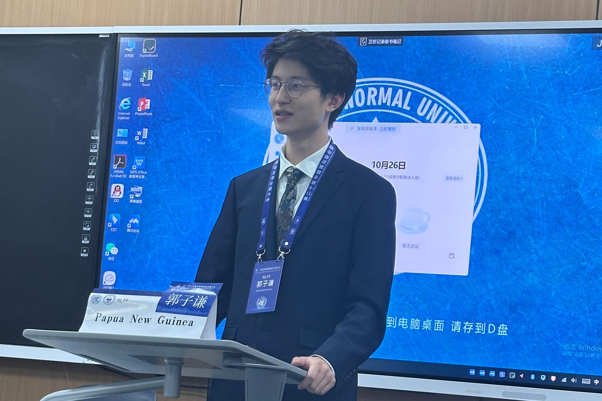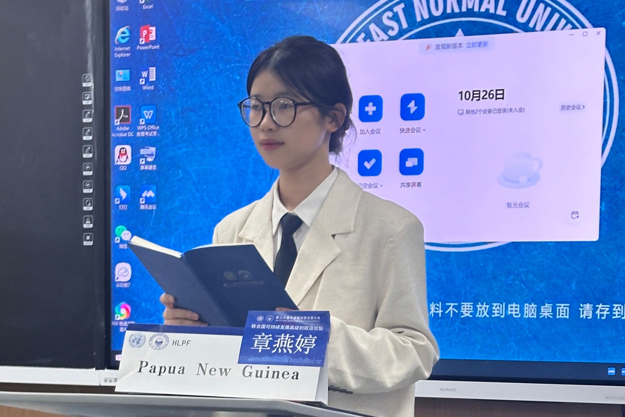 章燕婷与郭子谦在联合国可持续发展高级别政治论坛(HLPF,United Nations High-level Political Forum on Sustainable Development)“生物多样性与可持续发展目标”议题中作为巴布亚新几内亚代表团参加会议,坚持捍卫核心利益,在外来入侵物种、生态保护与经济发展平衡等问题上深入探索,并积极提出相关的解决方案,呼吁参会代表团重视脆弱国家与弱势群体利益。前中国联合国协会副会长兼总干事张丹女士表扬了章燕婷、郭子谦坚持维护自身席位利益的努力,肯定了他们的学术准备与会场表现。