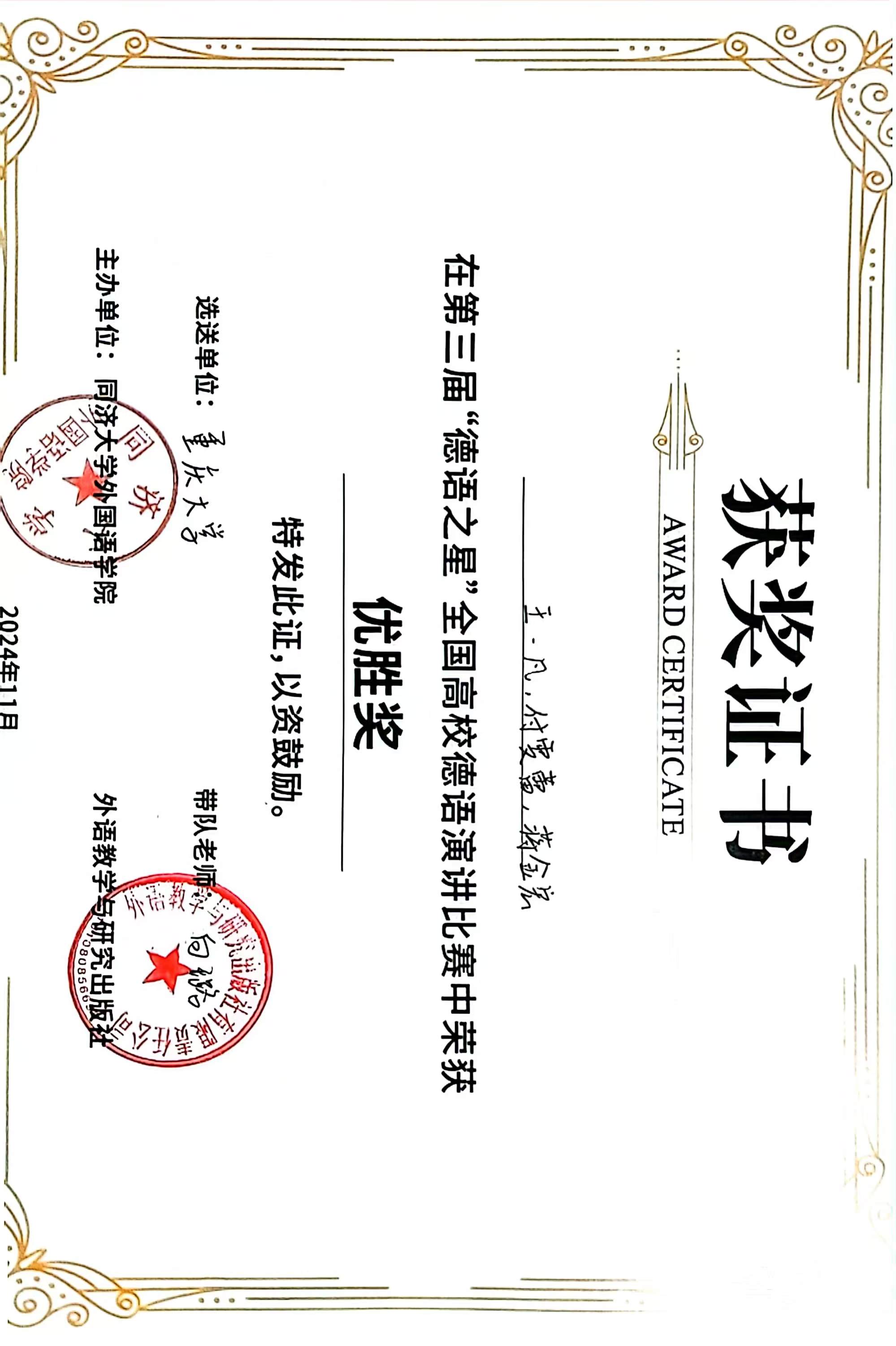将继续积极推进“以赛促学”的德语教学探索,努力培养学生过硬的外语专业实力,使学生具备身体力行讲好中国故事的决心和实力。