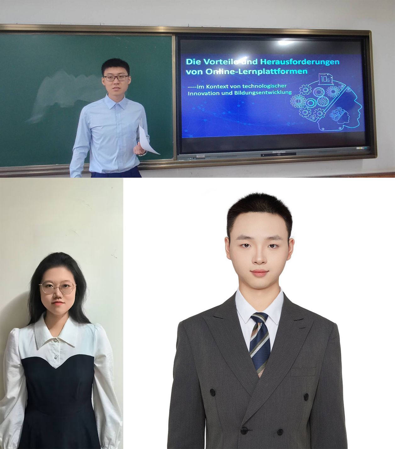 参赛团队成员2021级德语专业本科生王一凡,2022级德语专业本科生付雯蕾、蒋金宏根据《理解当代中国德语读写教程》第三课“China als Innovationsstandort”这一话题和十四五规划中关于科技创新和教育发展的相关政策,以Moocs平台为例,讲述了中国线上教育平台的优点以及面临的挑战,并提出一些解决网络教学平台问题的办法,最后展望中国在线教育光明未来。团队在指导教师向璐的指导下积极备战,历经多次文本修改、展示调整、模拟演练,最终取得佳绩。