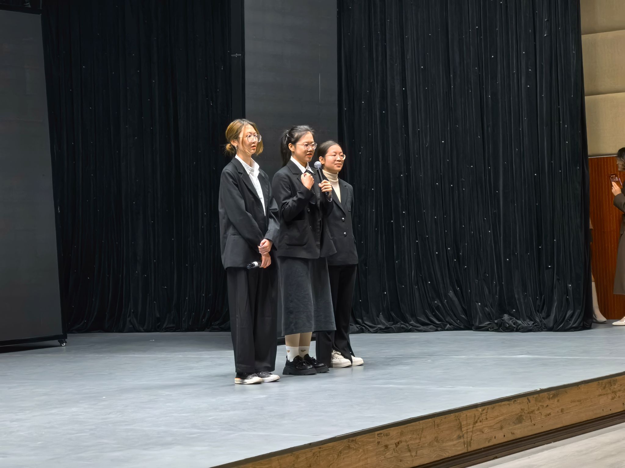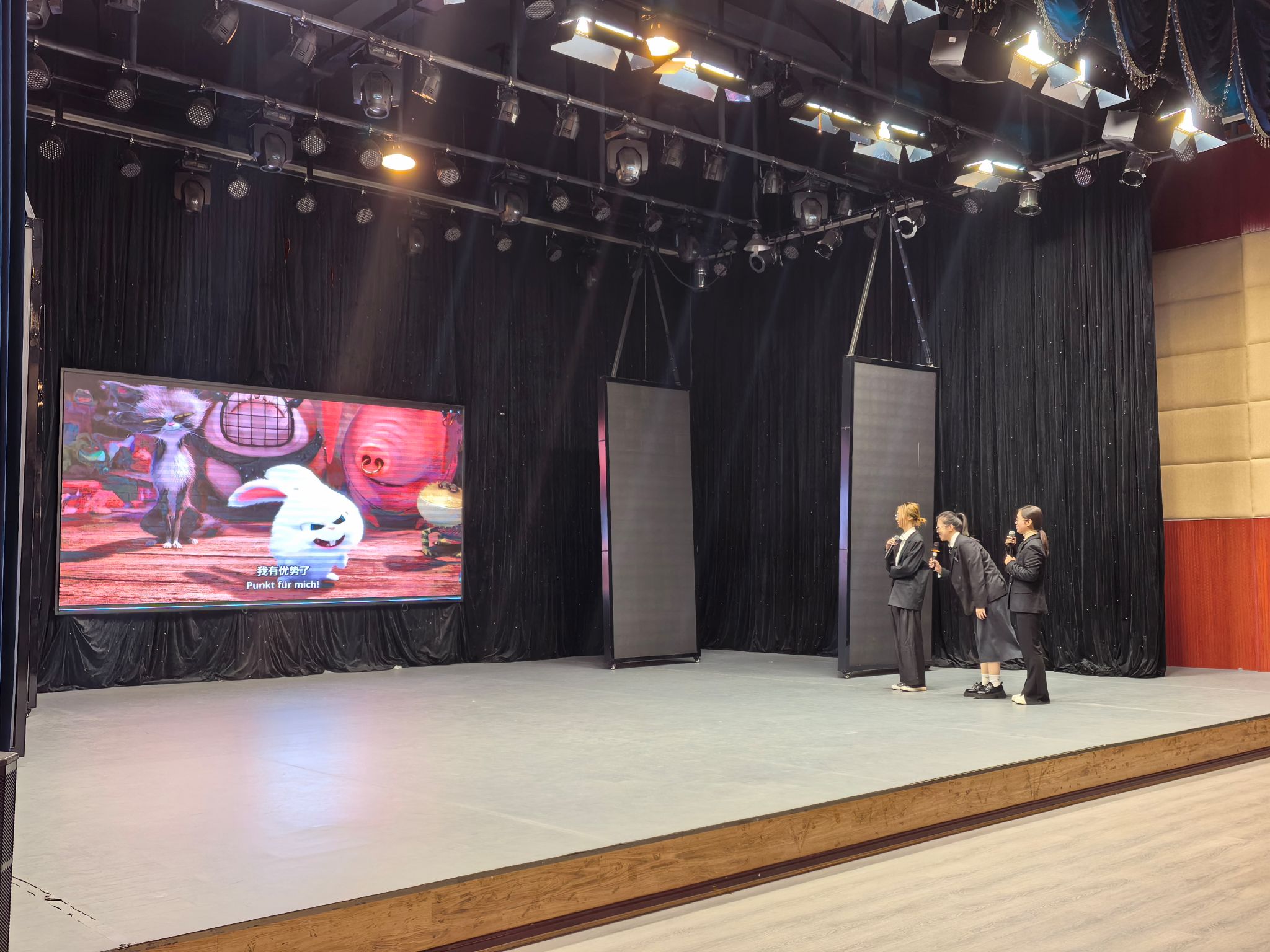参赛成员沉着冷静、心态平稳。在演讲过程中展现出不俗的德语口头表达能力与思辨能力;在配音环节,三位选手全情投入,用富有感染力的德语配音将一段电影选段演绎得妙趣横生;趣味猜词环节里,成员们灵活应变、配合默契,尽显团队协助精神。