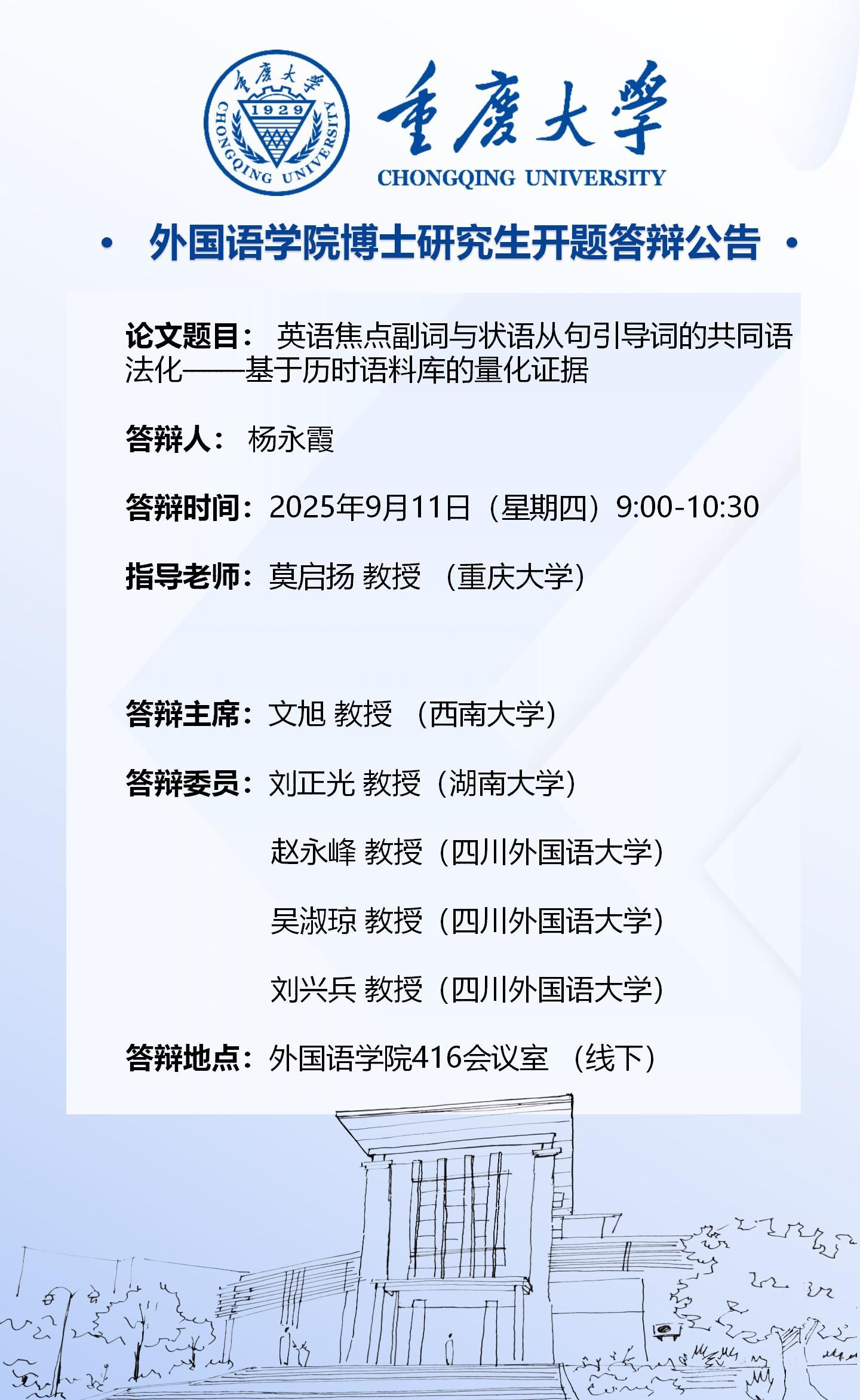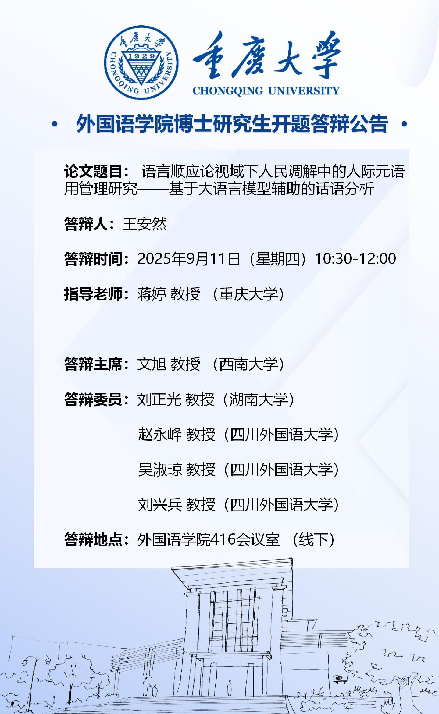 伦理电影 2023级外国语言文学专业(语言学方向)博士开题答辩将于2025年9月11日进行,答辩安排见附件。