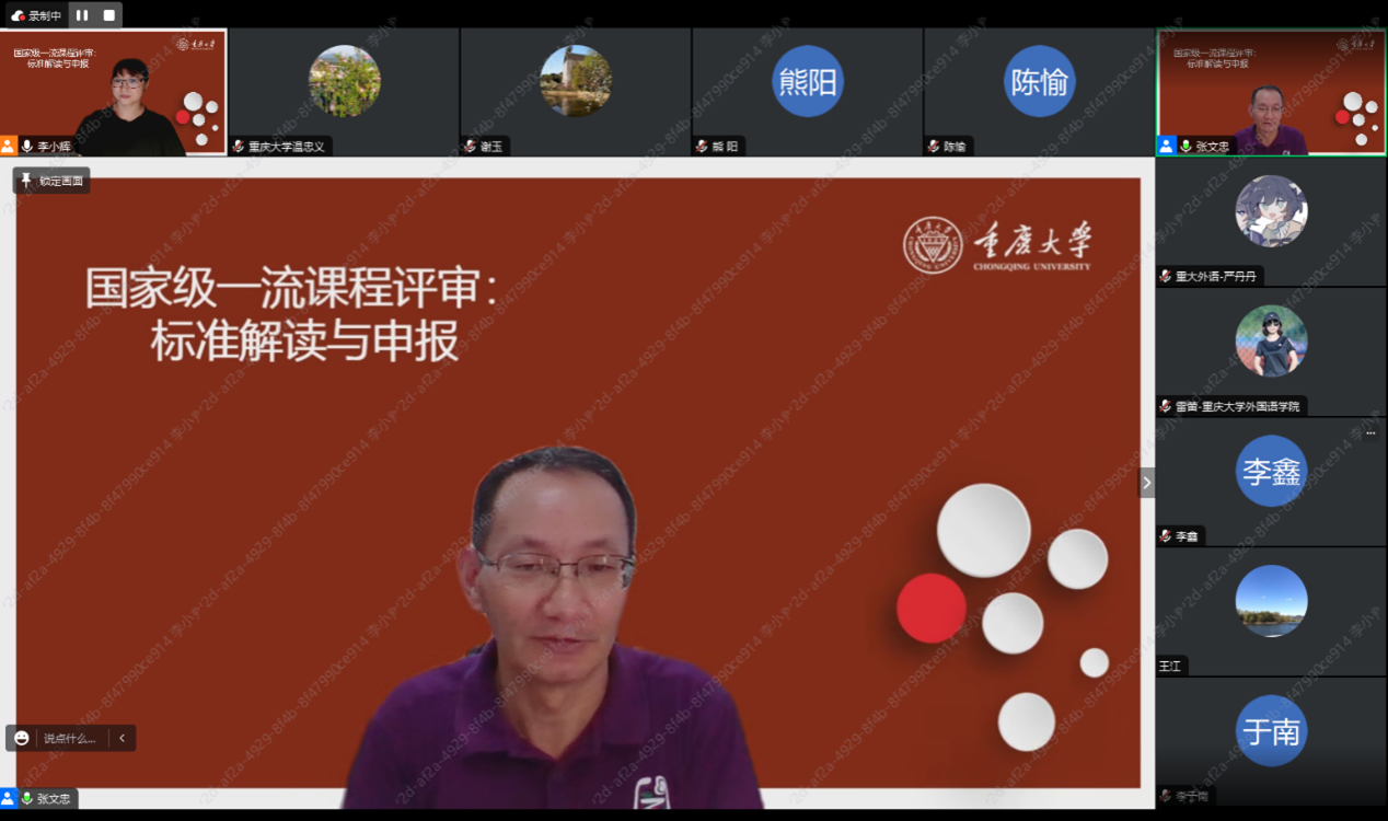 张文忠教授基于“国家级一流本科课程‘双万’计划”及相关政策向与会老师们详细阐释了国家级一流课程申报的范围与类别。通过对国家级一流课程申报要求与条件的分析,张教授结合目前已认定的外语类国家级一流课程现状,对评审标准与指标进行深度解读,并特别提醒老师们在撰写申报材料和课程建设过程中的若干注意事项。