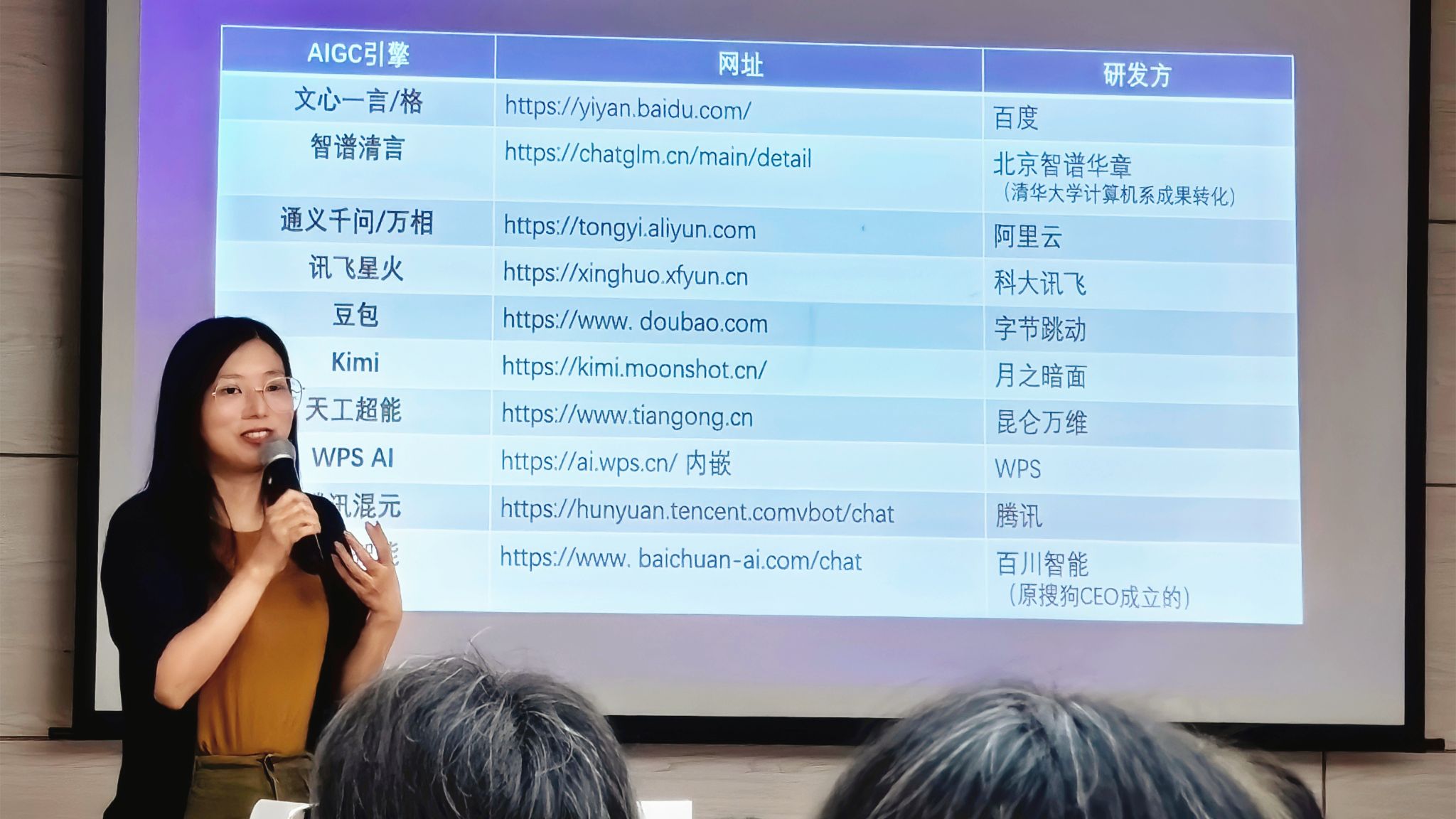 工作坊伊始,覃梦秋老师围绕“AI工具解锁”展开主题分享,全面介绍了人工智能的内涵及其在各平台和工具中的应用,包括AI写作、绘画、音视频制作、数字人等领域。通过实际操作演示和互动交流,教师们不仅亲身体验到了AI技术为外语教学带来的新机遇,还全面了解了当前国内外主流生成式AI模型的种类、特性及应用方法。