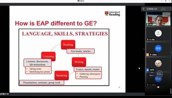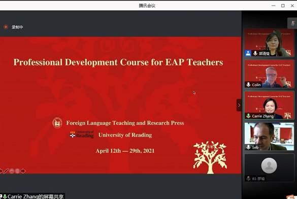 当前文化全球化、学术研究国际化的大趋势使学术英语教学的重要性日益凸显。《大学英语教学指南》(2020版)指出,大学英语在注重发展学生通用语言能力的同时,应进一步增强其学术英语交流能力,使学生在日常生活、专业学习和职业岗位等不同领域或语境中能用英语进行恰当有效的交流。因此,外语教学与研究出版社与英国雷丁大学于2021年4月12-29日联合举办“Professional Development Course for EAP Teachers”线上国际研修,旨在引进国外优质教师资源,帮助国内教师更新教学理念,拓展国际视野,提升教学能力和科研水平。