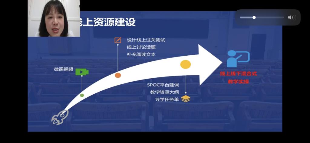 何欣忆老师首先介绍了疫情防控常态化后,全国全面进入网络教学和网络教研的新形势,线上、线下混合式教学将成为新常态。面对新的教学环境,新时代的数字原生代学生,外语教师应该如何呼应时代要求,积极做出改变,提供教学质量。何老师分享了新时代外语教师的机遇,以及教师们面临的挑战:课程内容设置要提升高阶性、突出创新性、增加挑战度。何老师以自己团队建设的《科技翻译》课程为例,分享了教育技术的迅猛发展如何影响和改变传统的翻译课堂,如何充分利用新技术的支撑进行教学设计,促进师生互动,如何将“线上”的网络学习与“线下”的课堂教学有机结合,达到“从线上要空间,向课外要时间”的效果。何老师讲座强调,无论教育技术、教育理念和课程设计如何创新,教师要秉承以学生为中心的初心不变,开展线上、线下相结合课堂教学创新与实践。